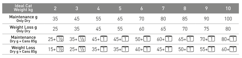 Es wird empfohlen, vor der Fütterung und vor einer Verlängerung der Anwendungsdauer einen Tierarzt zu konsultieren. Füttern Sie die unten angegebene, der Größe Ihrer Katze entsprechende Tagesmenge, als Alleinfutter.